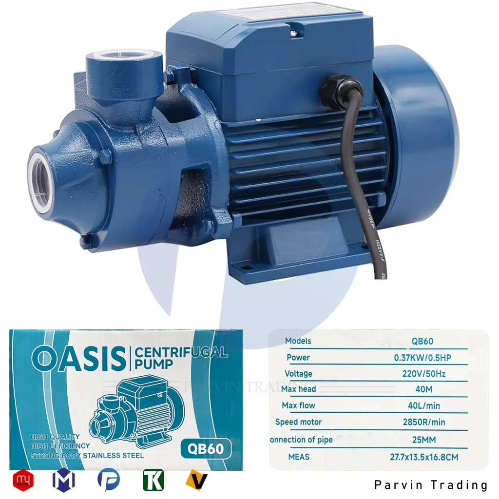 پمپ نیم اسب اوسیس از مزایای این پمپ میتوان به میزان انتقال اب تا ارتفاع 40 متر و حداکثر آبدهی 40 لیتر در دقیقه اشاره کرد.سیم پیچی مس, شفت استیل و پروانه برنز از دیگر ویژگی های این پمپ میباشد.